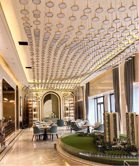洽談區(qū)吊燈繁多,安裝時為了展現(xiàn)造型組合在一起的線條優(yōu)美,千里馬裝飾施工隊伍煞費(fèi)苦心。