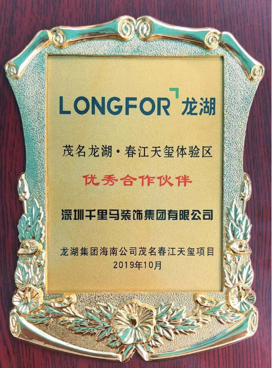 龍湖·春江天璽是龍湖集團(tuán)首入茂名打造的主城最高端品質(zhì)酒店式尊享社區(qū),深圳千里馬裝飾集團(tuán)作為承建單位不負(fù)眾望,將其營銷中心體驗區(qū)及樣板房建設(shè)得盡善盡美,無其倫比。因此,龍湖集團(tuán)授予深圳千里馬裝飾集團(tuán)“優(yōu)秀合作伙伴”獎牌以示感謝。