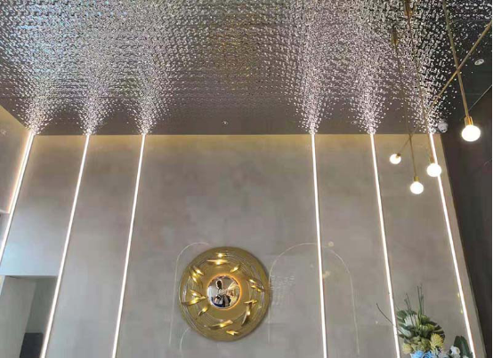 接待臺的水波紋天花,采用的是水波紋不銹鋼。