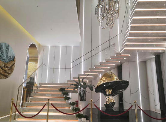 營銷中心體驗區(qū)的施工特點及難點主要在于異形不銹鋼的施工、材料種類多導(dǎo)致加工工序多、石材旋轉(zhuǎn)樓梯難度大等方面,深圳千里馬裝飾集團(tuán)有限公司施工隊伍不畏困難,堅持“工匠精神”不動搖,把品質(zhì)、工期和客戶滿意度放在第一位,給客戶提交了一份滿意的答卷。