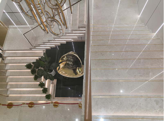其次是石材旋轉(zhuǎn)樓梯,設(shè)計排版要求高,安裝工藝精細(xì)。